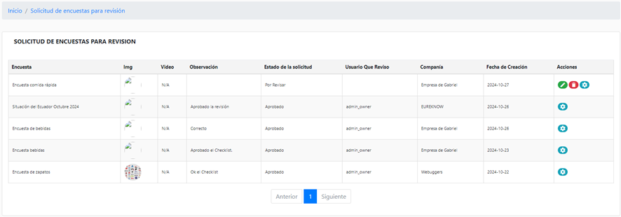 - Solicitudes de Encuestas: En la ventana “Solicitud de encuestas” es posible gestionar las encuestas enviadas para revisión.