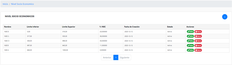 - N.S. Económico: Dentro de la ventana “N.S. Económico” se puede modificar, añadir o eliminar, en caso de ser necesario el nivel socioeconómico ya establecido. El nivel socioeconómico establecido, es utilizado para el cálculo del nivel al que pertenece cada panelista.