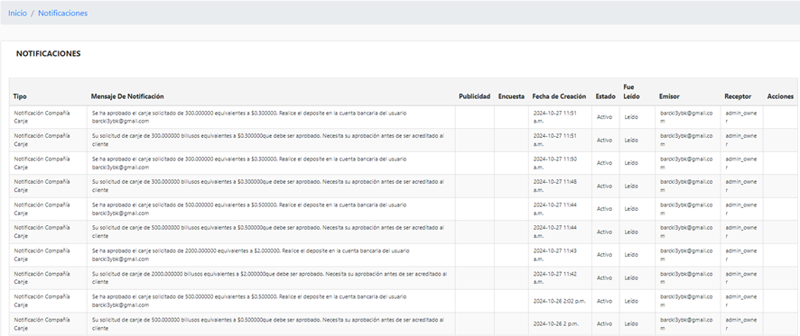 - Notificaciones: En esta sección es posible observar diversas notificaciones relacionadas a canjes, cuestionarios, entre otros.