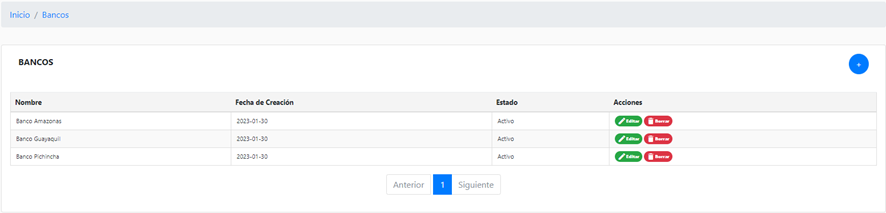 - Bancos: Dentro de la ventana “Bancos” se puede agregar nuevos bancos o modificar y eliminar los previamente creados. Los bancos agregados estarán disponibles en la aplicación móvil de Billusos para que los usuarios puedan elegirlos.