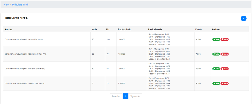- Dificultad Perfil: Dentro de la ventana “Dificultad Perfil” se puede modificar, añadir o eliminar, en caso de ser necesario los porcentajes de la dificultad del perfil. La dificultad de perfil modifica el precio de creación de una encuesta en relación con los porcentajes definidos.