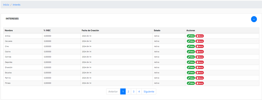 - Intereses: Dentro de la ventana “Intereses” se puede agregar nuevos intereses a la lista o modificar y eliminar los ya existentes. Los intereses agregados son parte de la segmentación de las encuestas.