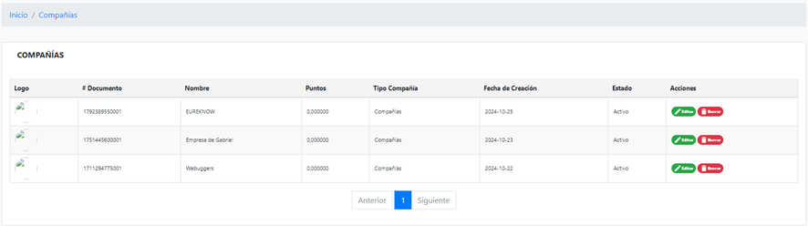 - Compañías: En la ventana "Compañías" se pueden visualizar todos los negocios o usuarios que se han registrado como negocios, así como modificar su información o eliminarlos definitivamente de la plataforma.