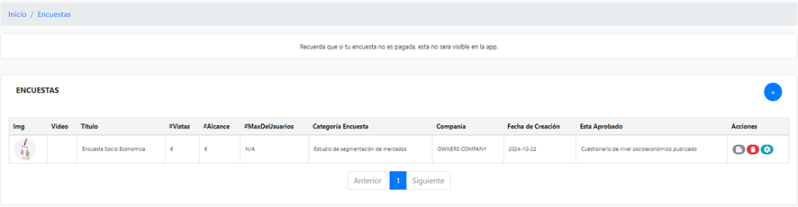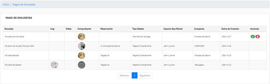 - Solicitudes de Pagos de Encuestas: En esta ventana es posible visualizar, aprobar, rechazar y eliminar el comprobante de pago de una encuesta.