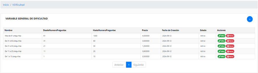 - Variables de Dificultad: Dentro de la ventana “Variables de dificultad” se puede modificar, añadir o eliminar, en caso de ser necesario las variables de dificultad. Las variables de dificultad establecidas modifican el costo de creación de una encuesta en relación con la cantidad de preguntas que este contenga.