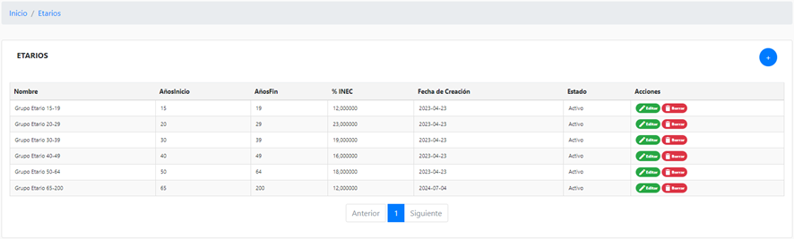 - Etarios: Dentro de la ventana “Etarios” se pueden añadir nuevos grupos etarios a la segmentación o modificar y eliminar los ya existentes.