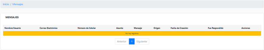 - Mensajes: En esta sección se visualizarán todos los mensajes enviados al administrador, además podrán ser respondidos directamente al remitente del mensaje.