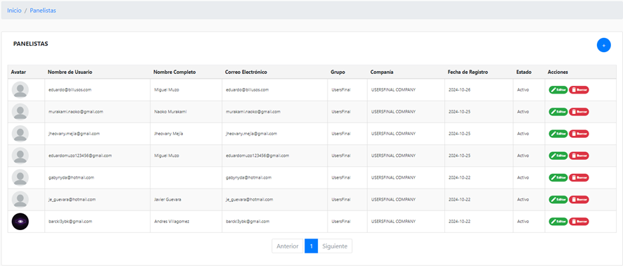 - Panelistas: En esta ventana se visualizan los panelistas registrados en la App de Billusos. Es posible crear un nuevo panelista presionando “+”, modificar la información o eliminar a un panelista ya existente.